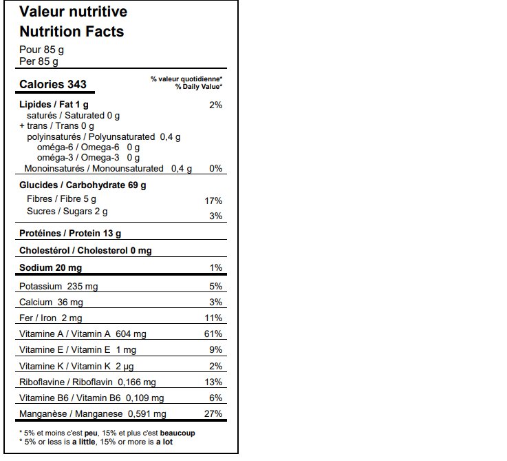 Semoule de blé, Farine de blé , Protéine de graines de citrouille*, Citrouille*, Carotte*, Patate douce*, Pomme*, Baie d'argousier*. Rien de plus! *Biologique, poudre déshydratée